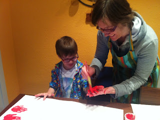 Sorry, it's a rubbish photo, but I'm too tired to take any more now :-( Do you get the idea? I'm really into peg crafts at the moment, and wanted to make a paper rose of some description to stick onto the painted peg (tissue paper? shiny paper?), but then M bug came up with the hand print idea, so we went with that. Here are the stages: